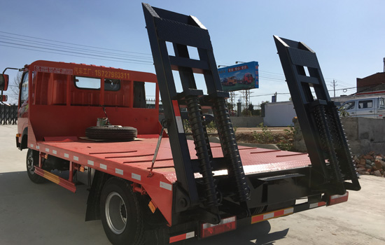 上裝配置:上裝橫梁采用100*100*5mmf方管,橫梁間距25公分,平板采用5mm或者8mm厚花紋板,爬梯采用雙簧加強設計,帶有簡易后支腿,可選擇液壓折疊爬梯,,平板長度4.1米 寬度,2.3米/2.4米兩種寬度可選, 平板離地高度90公分,是運輸8噸左右小型挖掘機、小型工程機械等最理想的拖車。